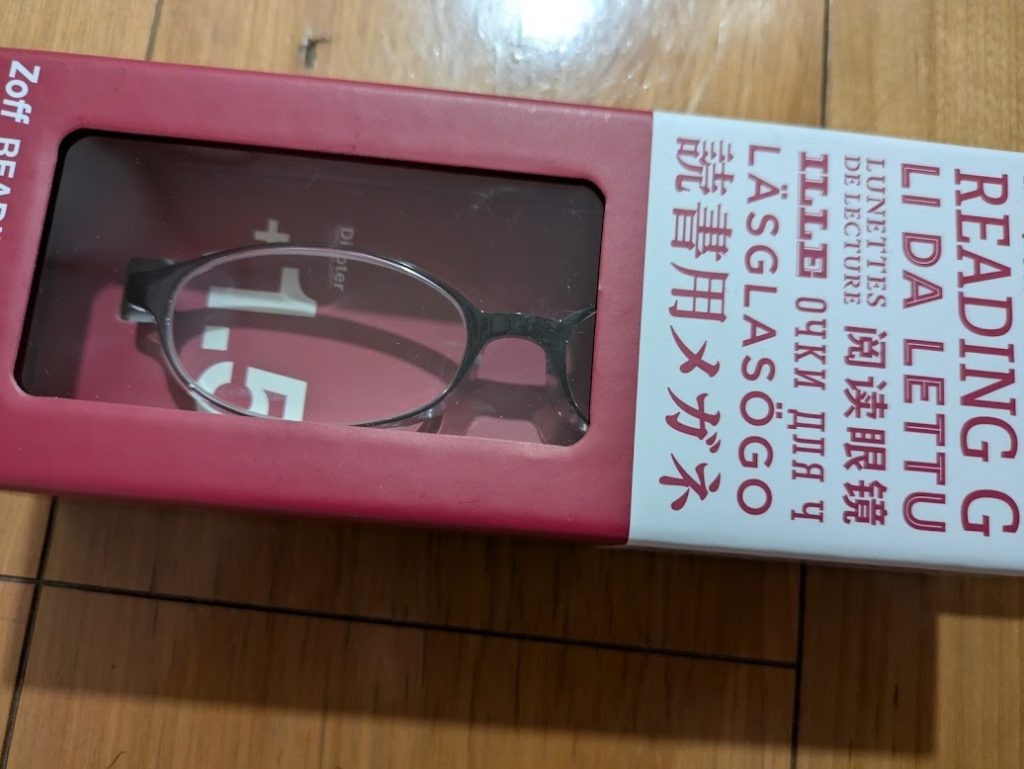 リストに無かったものである。実は最近老眼が来てて、スマホの文字が見えにくくなっている。何とか老眼鏡を使わずに過ごしていたけど、ソファを買って読書環境が充実してきたので、ちゃんと文字が見えるメガネが欲しくなった。初めはダイソーのやつを買ってみたけど、平面認識がしっかりできず面がやや凹んで見えて気持ち悪い。使い勝手が良くないのでちゃんとした眼鏡屋で買った。Zoffの読書用メガネ+1.5 5500円。ダイソーの50倍の値段だ。50倍の効果があるかと言われれば難しいけど、よく見える。本を読むときはだいたい着用している。