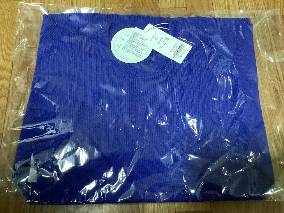 深い青色が夏っぽい。パッと見で気に入った。驚きの青さだが、青は黒や茶色と相性がいいので持ってる服との着合わせがしやすい。ただし主張が強い分、上から何か着る場合は途端に全体のトーンが濁る。これは夏に単品で使う分には活躍するけど、シーズンが過ぎると着こなしが難しい。