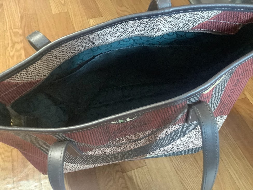 なんとなく見た目の色使いに惹かれて購入。収納力が高いのでたくさんものが入る。個人的にトートが好きなので買ってしまった。町田のブックオフで中古だけど、ほぼ新品状態。イタリアのブランドらしいが詳しくは知らない。定価で買うと3万くらい。